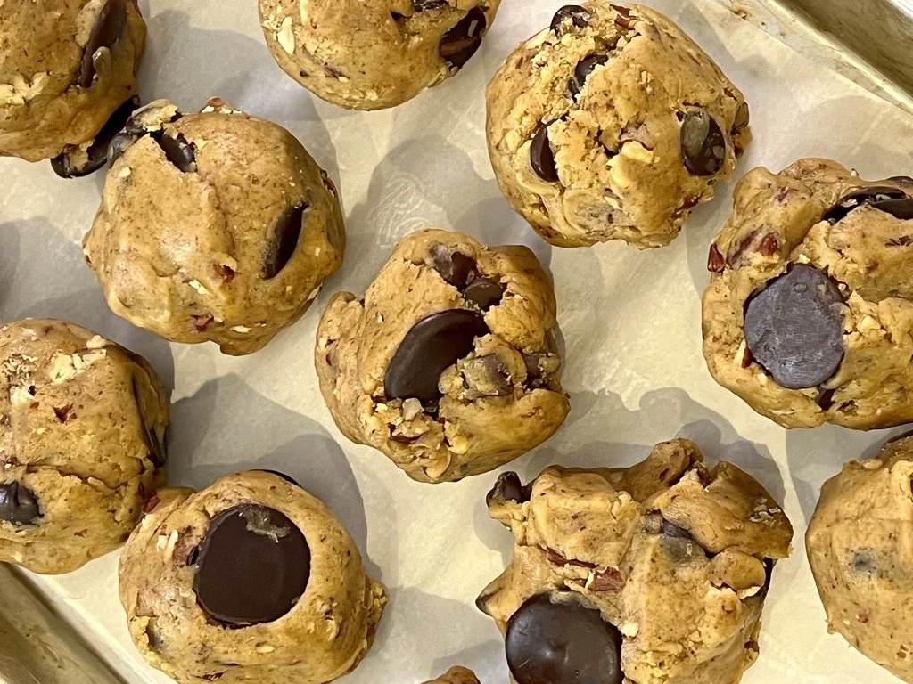 Once dough has chilled, scoop into balls that are slightly bigger than a golf ball. (At this point, I put them on a quarter sheet tray in the freezer, once frozen solid, I transfer them to a resealable freezer bag, so I always have homemade CCC dough at the ready!).